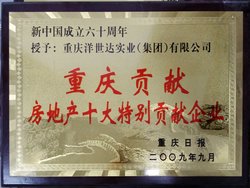 ? 2009年,洋世達(dá)集團(tuán)被評為新中國成立60周年“重慶貢獻(xiàn)?房地產(chǎn)十大貢獻(xiàn)企業(yè)”、“重慶市綠化先進(jìn)單位”、南岸區(qū)工商聯(lián)(總商會) 南岸區(qū)民營企業(yè)家協(xié)會2009年度優(yōu)秀會長單位、南岸區(qū)2008年度風(fēng)云企業(yè)評選年度招商企業(yè)、南岸區(qū)文明單位