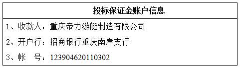 5、本次采購(gòu)根據(jù)《重慶帝力游艇制造有限公司招投標(biāo)管理辦法》采用單一采購(gòu)方式進(jìn)行開(kāi)標(biāo)、唱標(biāo)、評(píng)標(biāo)、談判、定標(biāo)。